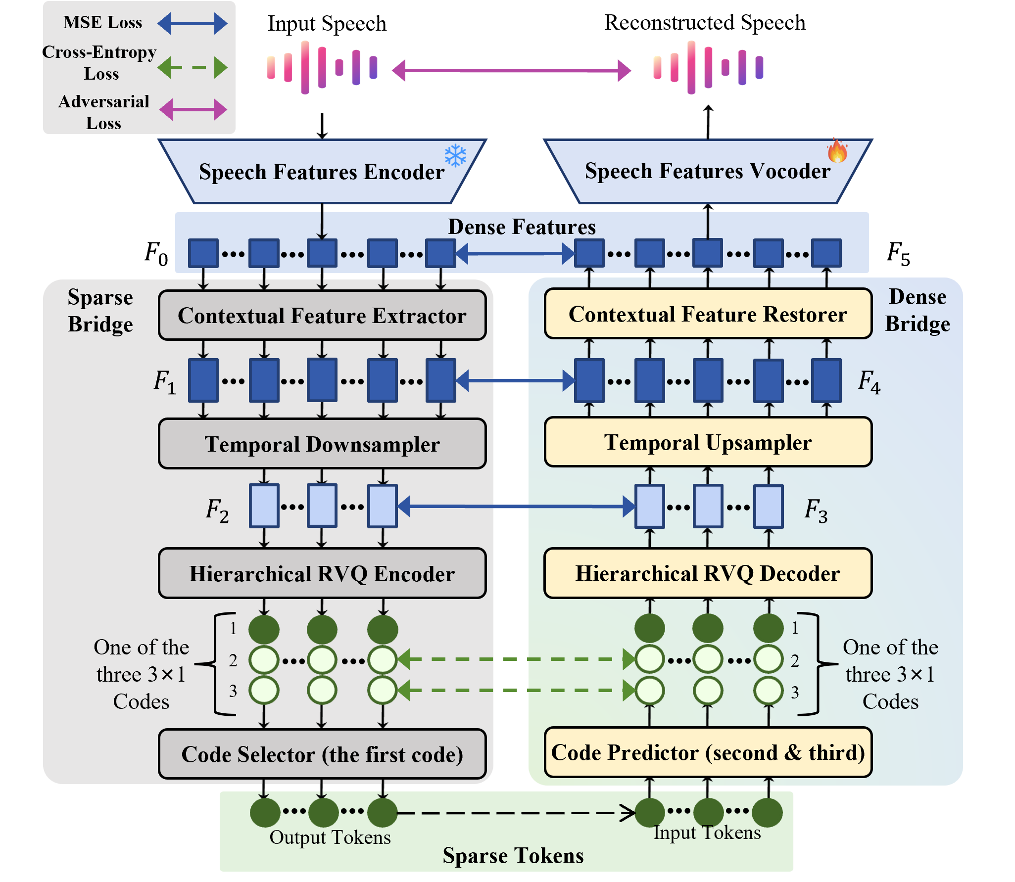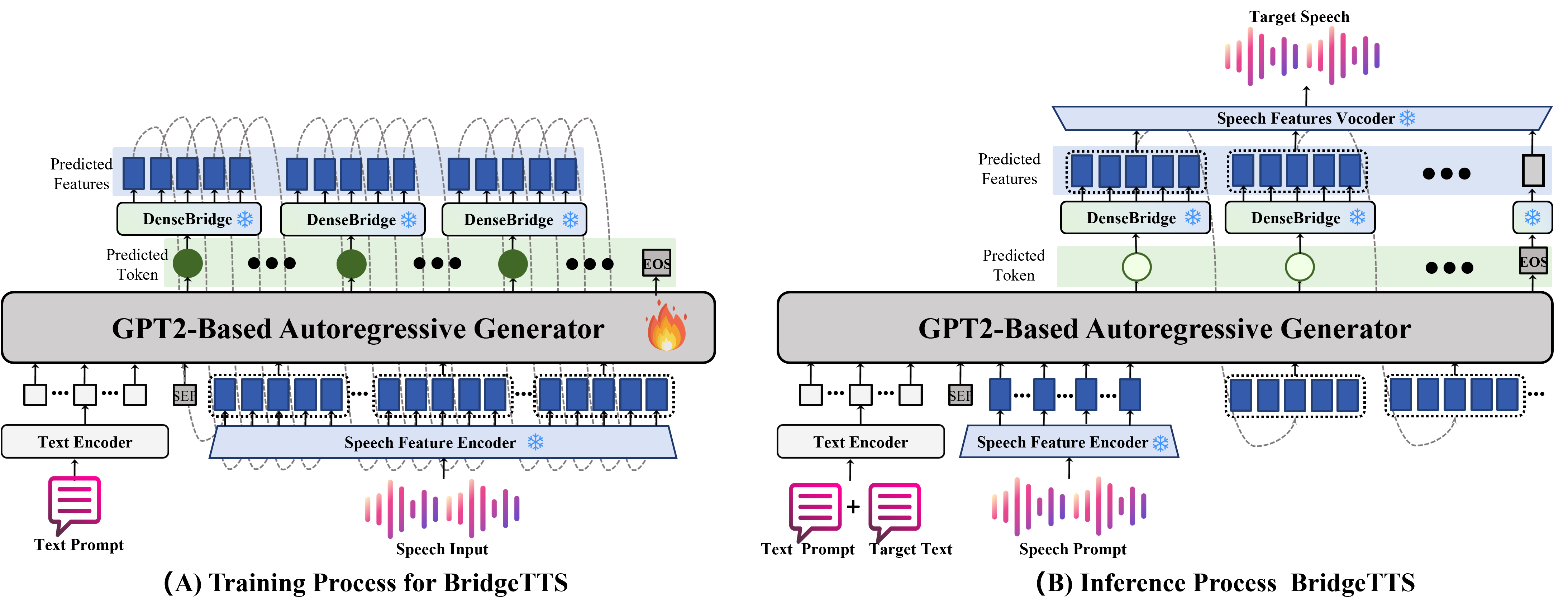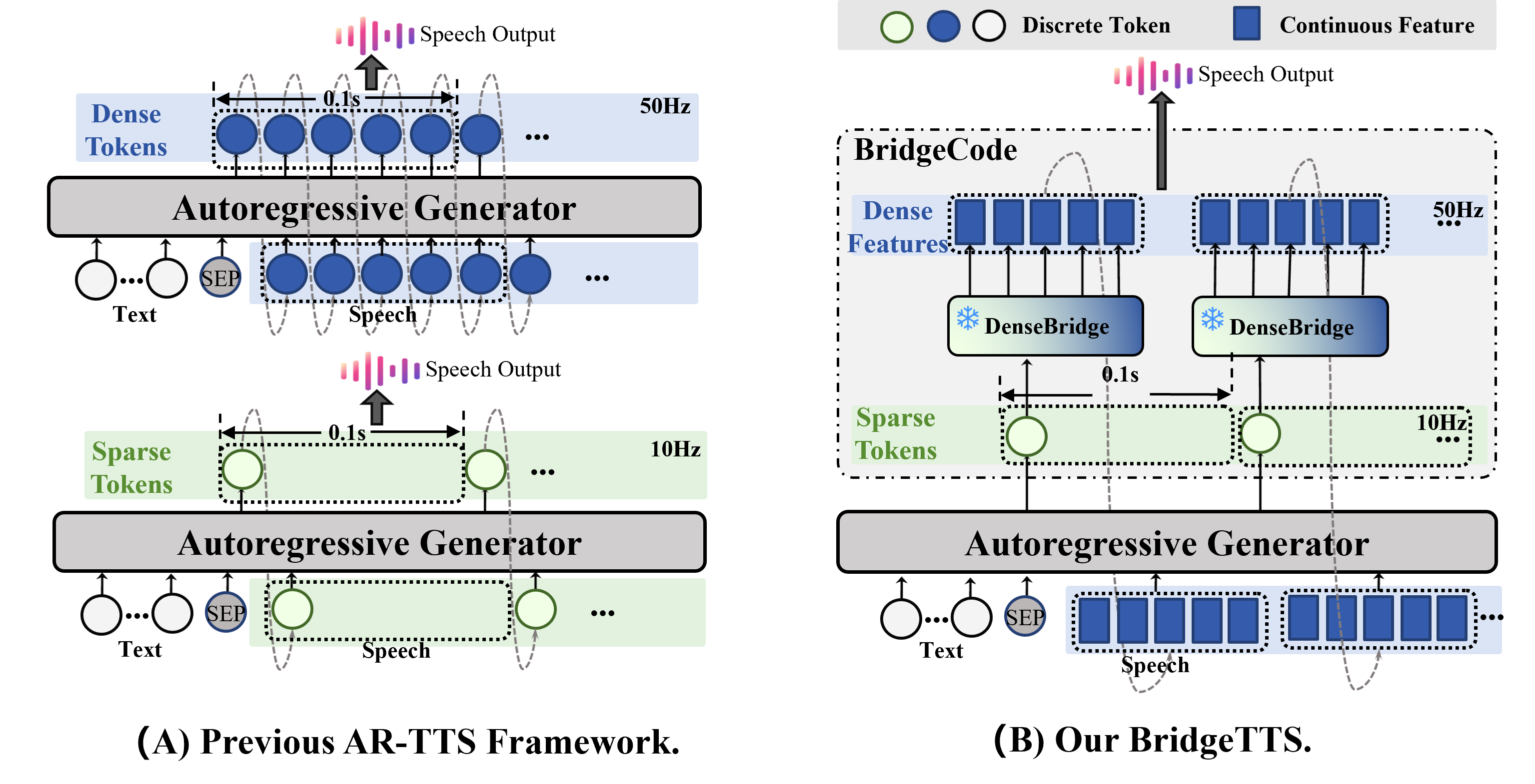 Autoregressive (AR) frameworks have recently achieved remarkable progress in zero-shot text-to-speech (TTS) by leveraging discrete speech tokens and large language model techniques. Despite their success, existing AR-based zero-shot TTS systems face two critical limitations: (i) an inherent speed–quality trade-off, as sequential token generation either reduces frame rates at the cost of expressiveness or enriches tokens at the cost of efficiency, and (ii) a text-oriented supervision mismatch, as cross-entropy loss penalizes token errors uniformly without considering the fine-grained acoustic similarity among adjacent tokens. To address these challenges, we propose \textbf{BridgeTTS}, a novel AR-TTS framework built upon the dual speech representation paradigm \textbf{BridgeCode}. BridgeTTS reduces AR iterations by predicting sparse tokens while reconstructing rich continuous features for high-quality synthesis. Joint optimization of token-level and feature-level objectives further enhances naturalness and intelligibility. Experiments demonstrate that BridgeTTS achieves competitive quality and speaker similarity while significantly accelerating synthesis. Speech demos are available at https://test1562.github.io/demo/.